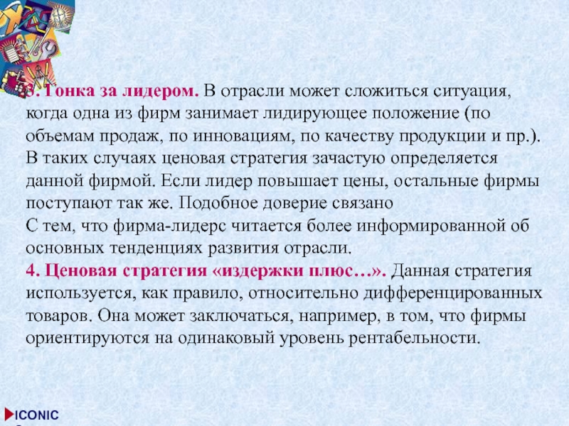 инновациям, по качеству продукции и пр.). В таких случаях ценовая стратегия зачастую определяется данной фирмой. Если лидер повышает цены, остальные фирмы поступают так же. Подобное доверие связано