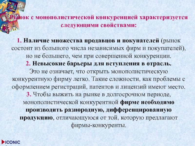 Слайд 21Рынок с монополистической конкуренцией характеризуется следующими свойствами: