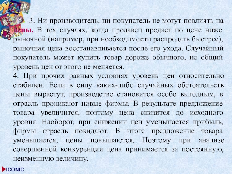 4. При прочих равных условиях уровень цен относительно стабилен. Если в силу каких-либо случайных обстоятельств цены вырастут, производство становится особо выгодным, в отрасль проникают новые фирмы. В результате предложение товара увеличится, поэтому цена снизится до исходного уровня. Наоборот, при снижении цен уменьшается прибыль, фирмы отрасль покидают. В итоге предложение товара уменьшается, цены повышаются. Поэтому при анализе совершенной конкуренции цена принимается за постоянную, неизменную величину.