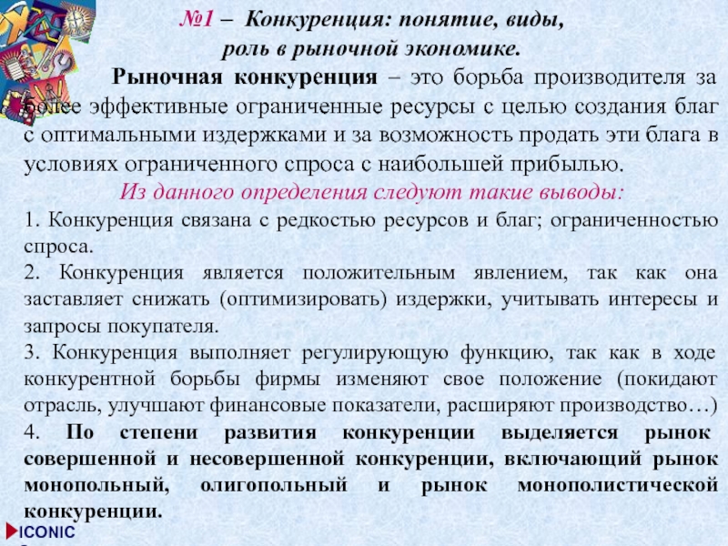 1. Конкуренция связана с редкостью ресурсов и благ; ограниченностью спроса.
