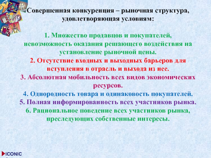 Слайд 9Совершенная конкуренция – рыночная структура, удовлетворяющая условиям: