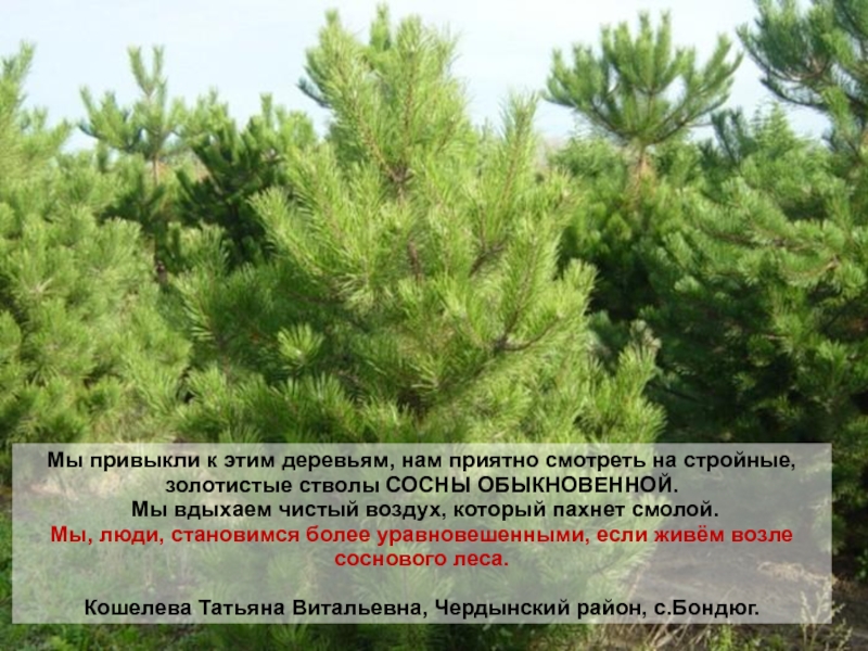 Сосна обыкновенная - смелое дерево. Это дерево очень любит солнце и потому всегда свои вечнозеленые ветки поднимает к нему.