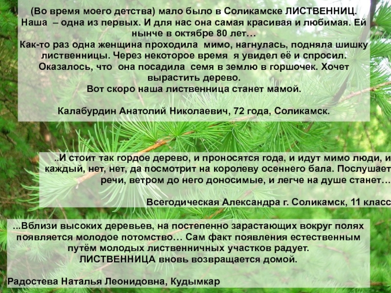 (Во время моего детства) мало было в Соликамске ЛИСТВЕННИЦ.