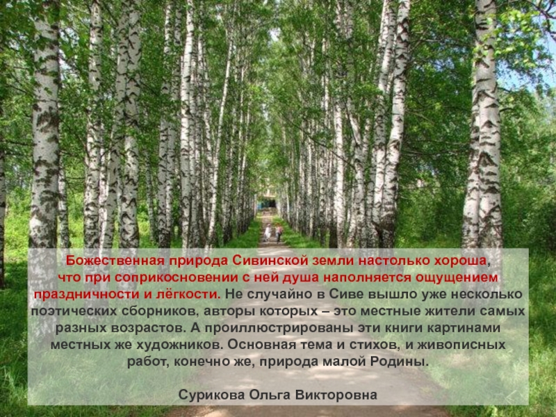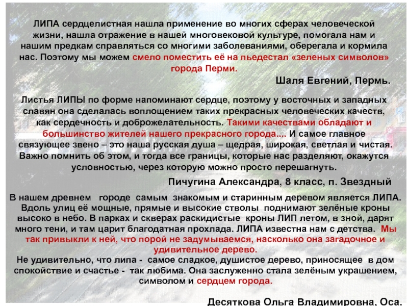 Как бы ни полезна была ЛИПА, всё же красота её значит не меньше. Невозможно представить себе нашу Россию без светлых липовых лесов, где так легко дышится и всегда чуть-чуть пахнет мёдом… Может быть потому, что у ЛИПЫ душа доброй девочки, у древних славянских народов ЛИПА считалась деревом богини Лады – покровительницы красоты и любви. ...липа — одно из настоящих чудес природы. И просто замечательно, что это дерево является зеленым символом Осинского муниципального района.