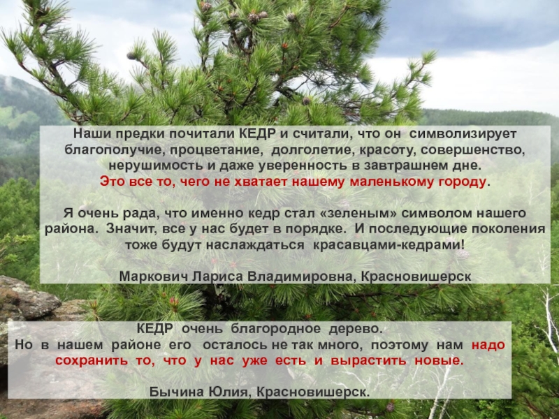 СОСНА КЕДРОВАЯ или КЕДР, очень похож на наших людей. Посмотрите сами. Это вечнозеленое дерево, вот и мы всегда полны жизни, что летом, что зимой, если вы приедете к нам, вас встретят как родного, с улыбкой на лице.