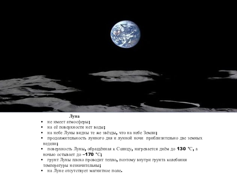 поверхность Луны, обращённая к Солнцу, нагревается днём до 130 °С, а ночью остывает до –170 °С;