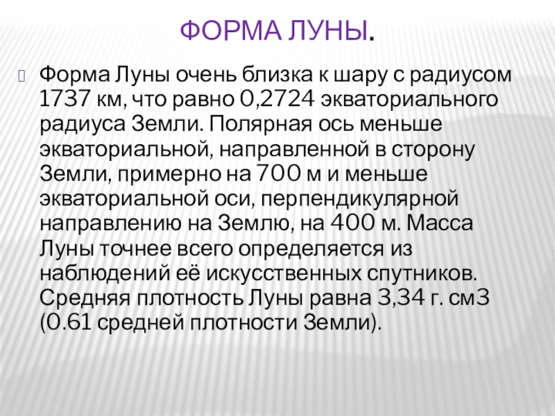 экваториальной, направленной в сторону Земли, примерно на 700 м и меньше экваториальной оси, перпендикулярной направлению на Землю, на 400 м. Масса Луны точнее всего определяется из наблюдений её искусственных спутников. Средняя плотность Луны равна 3,34 г. см3 (0.61 средней плотности Земли).