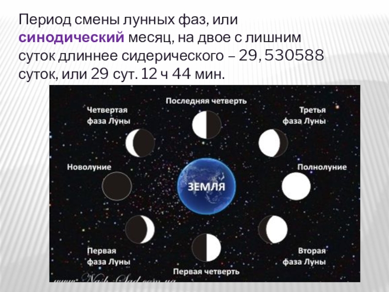 Слайд 12Период смены лунных фаз, или синодический месяц, на двое с