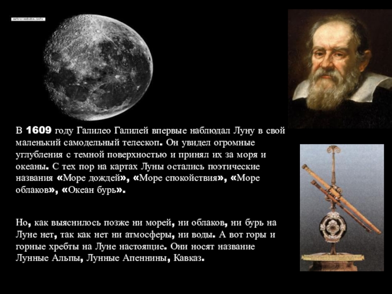 Но, как выяснилось позже ни морей, ни облаков, ни бурь на Луне нет, так как нет ни атмосферы, ни воды. А вот горы и горные хребты на Луне настоящие. Они носят название Лунные Альпы, Лунные Апеннины, Кавказ.