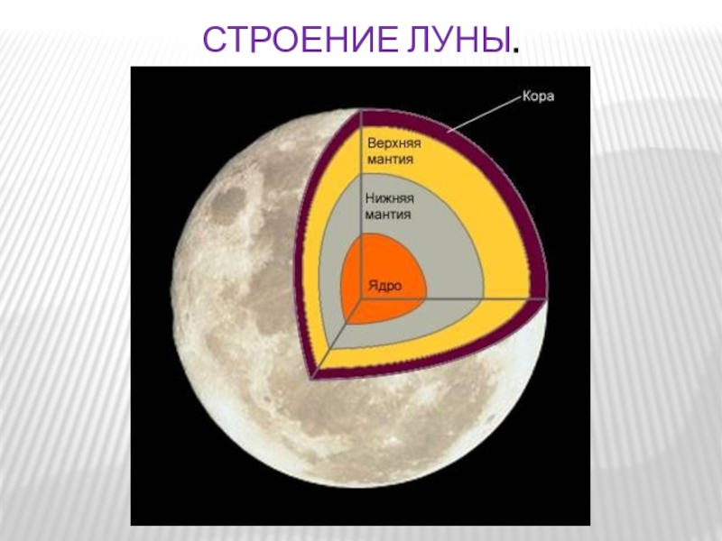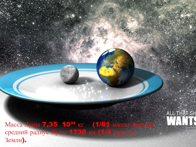 Слайд 7Масса Луны 7,35 10²² кг (1/81 массы Земли), средний