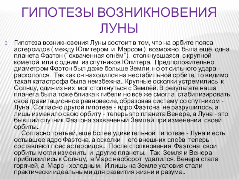 Согласно третьей, ещё более удивительной гипотезе - Луна и есть остывшее ядро Фаэтона, а осколки его внешних слоёв теперь составляют пояс астероидов.. После столкновения Фаэтона свои орбиты могли изменить и другие планеты.. Так Земля и Венера приблизились к Солнцу, а Марс наоборот удалился. Венера стала горячей, а Марс - холодным. И лишь на Земле условия стали практически идеальными для развития жизни и разума..