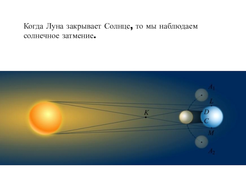 Слайд 15Когда Луна закрывает Солнце, то мы наблюдаем солнечное затмение.