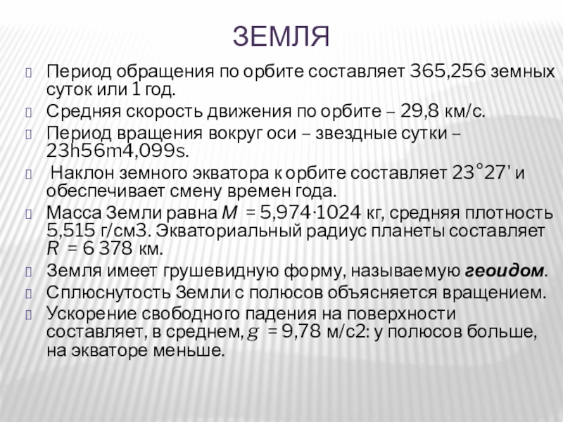 Масса Земли равна М = 5,974∙1024 кг, средняя плотность 5,515 г/см3. Экваториальный радиус планеты составляет R = 6 378 км.