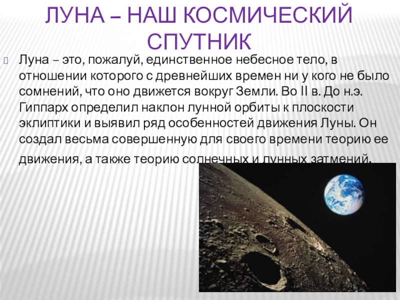 оно движется вокруг Земли. Во II в. До н.э. Гиппарх определил наклон лунной орбиты к плоскости эклиптики и выявил ряд особенностей движения Луны. Он создал весьма совершенную для своего времени теорию ее движения, а также теорию солнечных и лунных затмений.