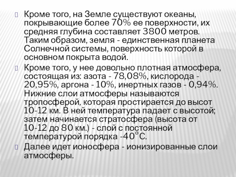 Слайд 22Кроме того, на Земле существуют океаны, покрывающие более 70% ее