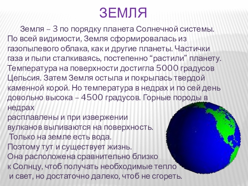 Частички газа и пыли сталкиваясь, постепенно “растили” планету. Температура на поверхности достигла 5000 градусов Цельсия. Затем Земля остыла и покрылась твердой каменной корой. Но температура в недрах и по сей день довольно высока – 4500 градусов. Горные породы в недрах