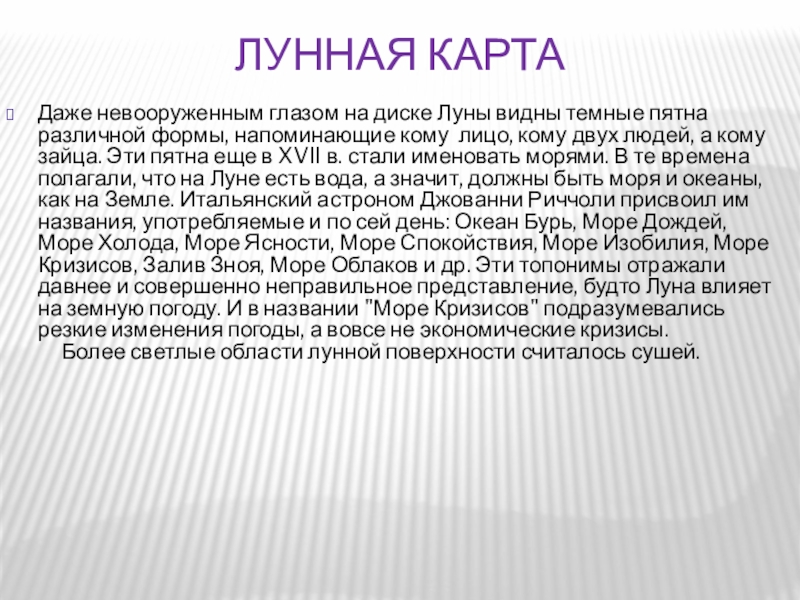 и принял их за моря и океаны. С тех пор на картах Луны остались поэтические названия «Море дождей», «Море спокойствия», «Море облаков», «Океан бурь».