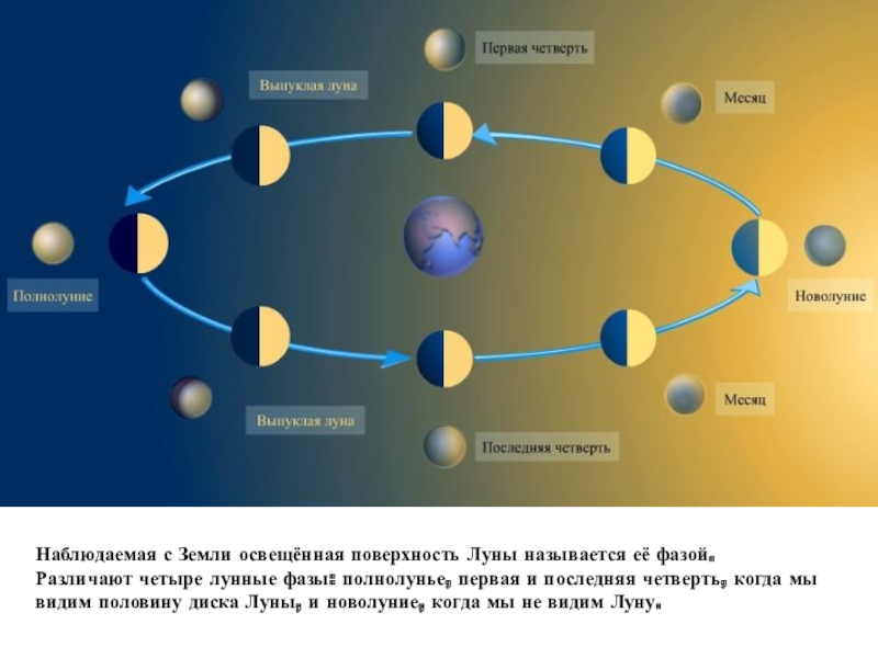 Слайд 13Наблюдаемая с Земли освещённая поверхность Луны называется её фазой.