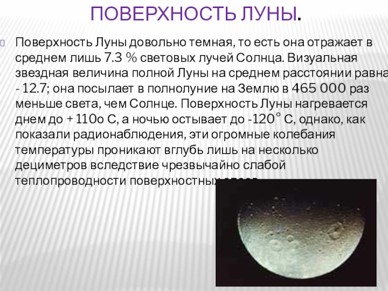 полной Луны на среднем расстоянии равна - 12.7; она посылает в полнолуние на Землю в 465 000 раз меньше света, чем Солнце. Поверхность Луны нагревается днем до + 110о С, а ночью остывает до -120° С, однако, как показали радионаблюдения, эти огромные колебания температуры проникают вглубь лишь на несколько дециметров вследствие чрезвычайно слабой теплопроводности поверхностных слоев.