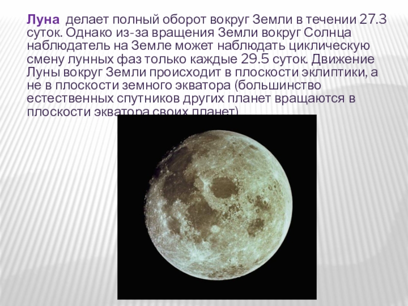 Слайд 4Луна делает полный оборот вокруг Земли в течении 27.3 суток.