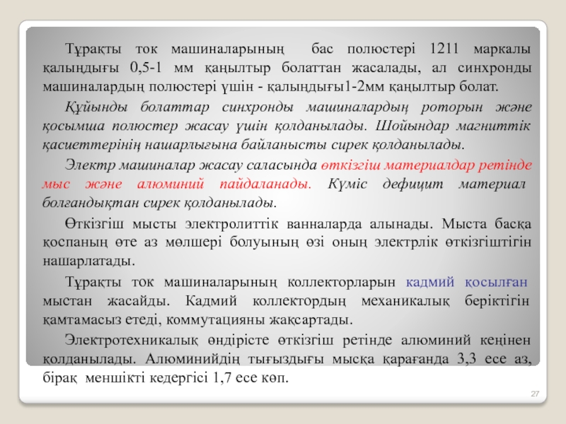 Слайд 27Тұрақты ток машиналарының бас полюстері 1211 маркалы қалыңдығы 0,5-1 мм