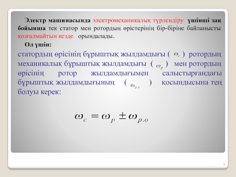 Слайд 3Электр машинасында электромеханикалық түрлендіру үшінші заң бойынша тек статор мен