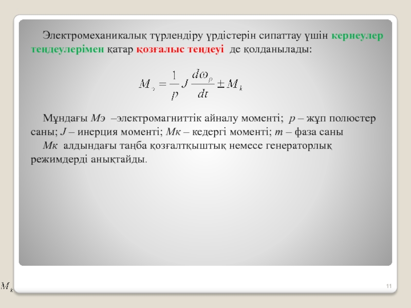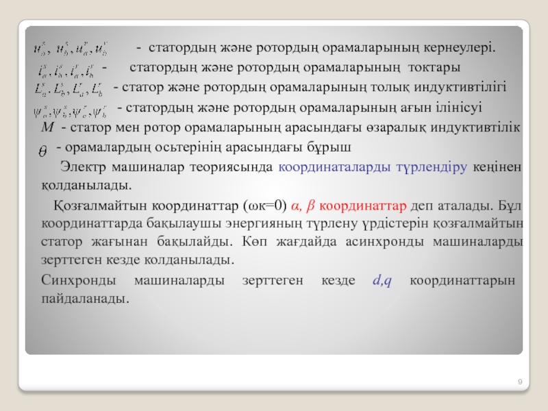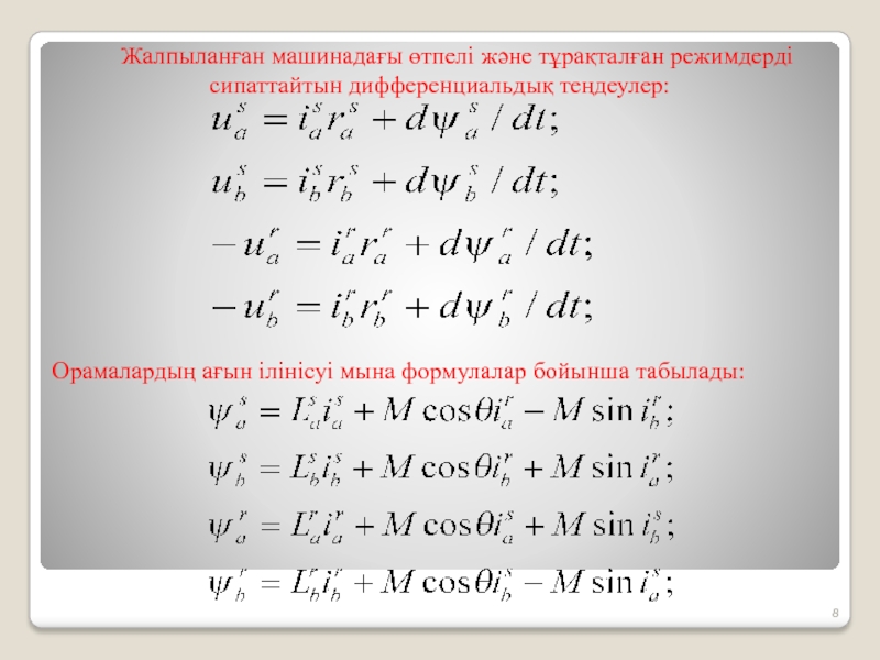 Слайд 8Жалпыланған машинадағы өтпелі және тұрақталған режимдерді сипаттайтын дифференциальдық теңдеулер: