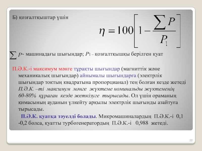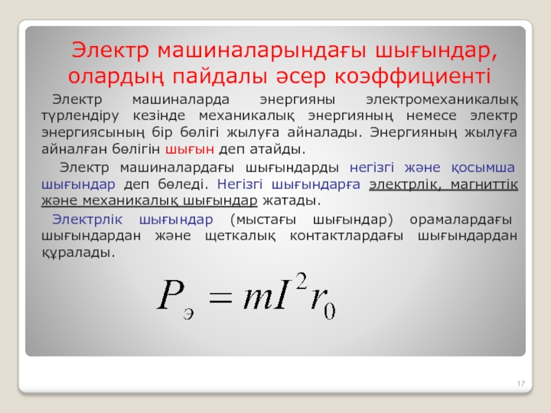 Слайд 17Электр машиналарындағы шығындар, олардың пайдалы әсер коэффициенті