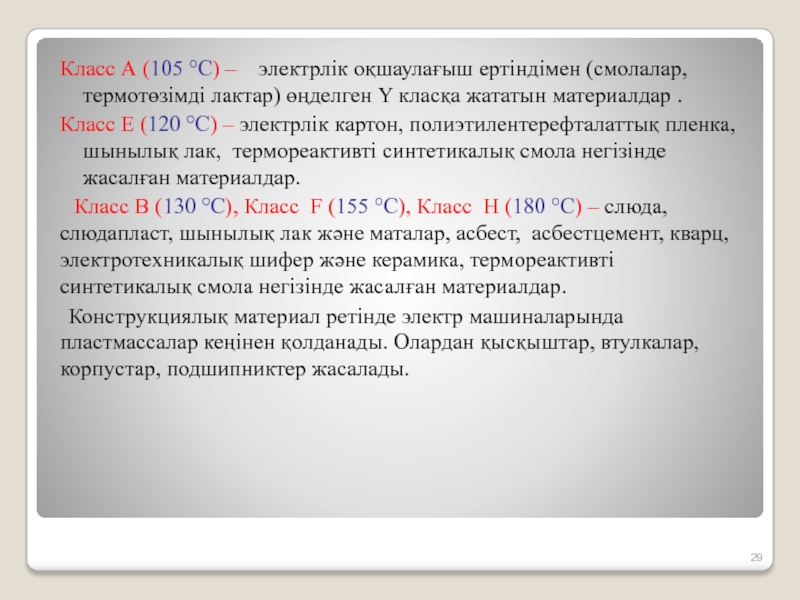 Слайд 29Класс А (105 °С) – электрлік оқшаулағыш ертіндімен (смолалар,