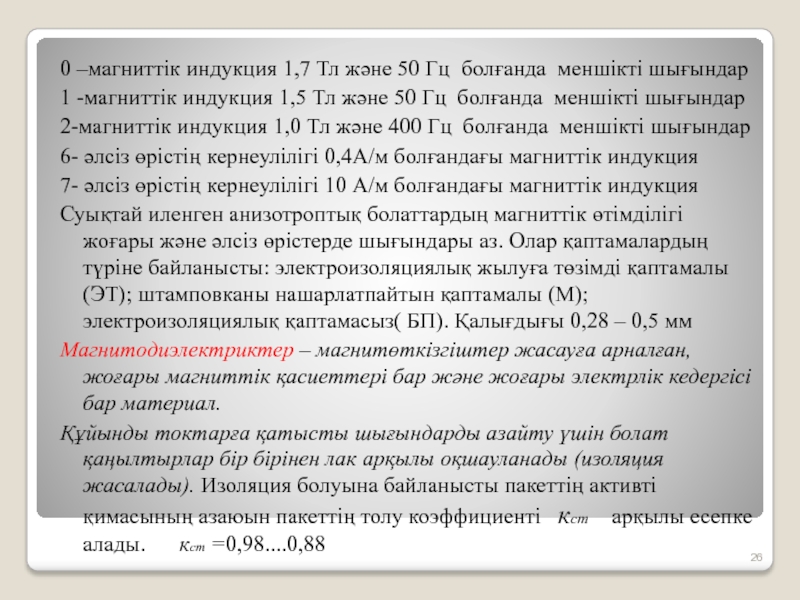 Слайд 260 –магниттік индукция 1,7 Тл және 50 Гц болғанда меншікті