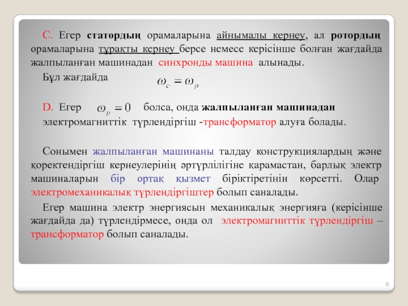Слайд 6С. Егер статордың орамаларына айнымалы кернеу, ал ротордың орамаларына тұрақты