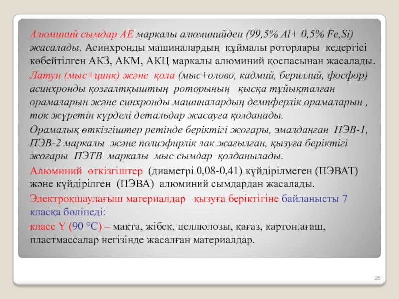 Слайд 28Алюминий сымдар АЕ маркалы алюминийден (99,5% Al+ 0,5% Fe,Si) жасалады.