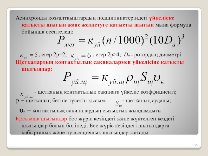 Слайд 20Асинхронды қозғалтқыштардың подшипниктеріндегі үйкеліске қатысты шығын және желдетуге қатысты шығын