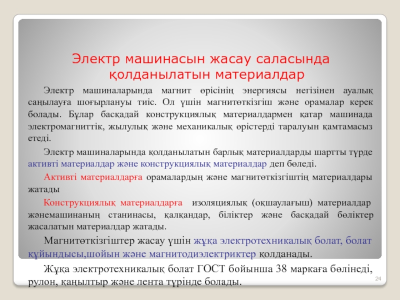 Слайд 24Электр машинасын жасау саласында қолданылатын материалдар