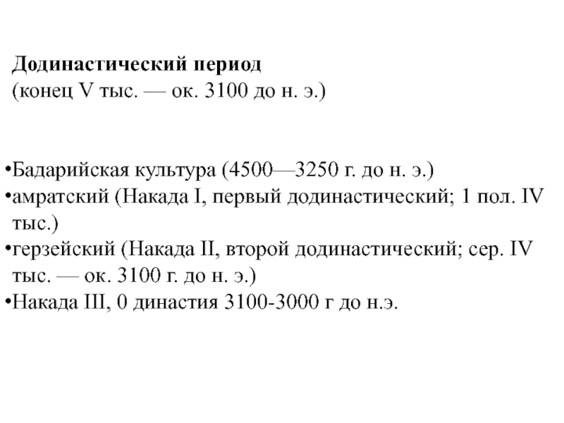 Додинастический период (конец V тыс. — ок. 3100 до н. э.)Бадарийская культура (4500—3250 г. до н. э.)амратский (Накада I, первый