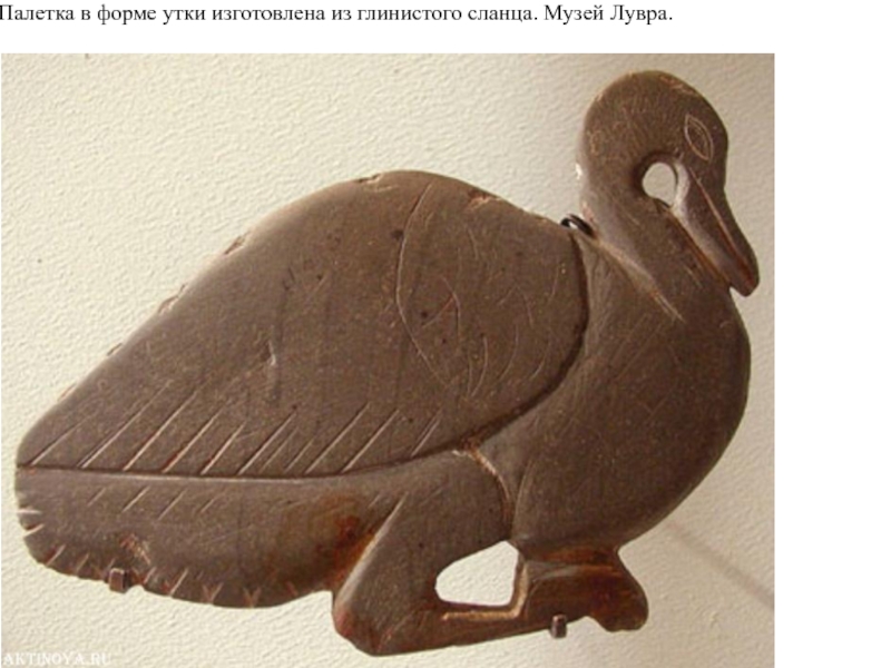 Слайд 20Палетка в форме утки изготовлена из глинистого сланца. Музей Лувра.