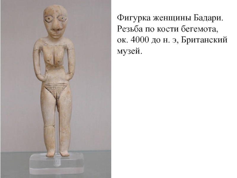 Слайд 10Фигурка женщины Бадари. Резьба по кости бегемота, ок. 4000 до