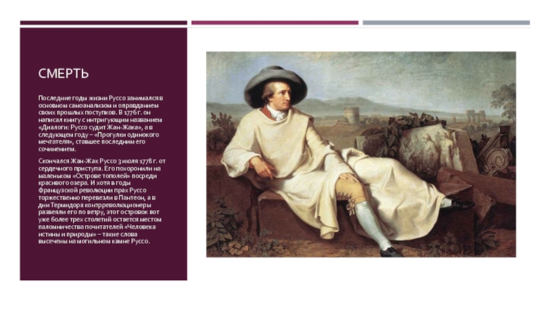 Скончался Жан-Жак Руссо 3 июля 1778 г. от сердечного приступа. Его похоронили на маленьком «Острове тополей» посреди красивого озера. И хотя в годы Французской революции прах Руссо торжественно перевезли в Пантеон, а в дни Термидора контрреволюционеры развеяли его по ветру, этот островок вот уже более трех столетий остается местом паломничества почитателей «Человека истины и природы» – такие слова высечены на могильном камне Руссо.