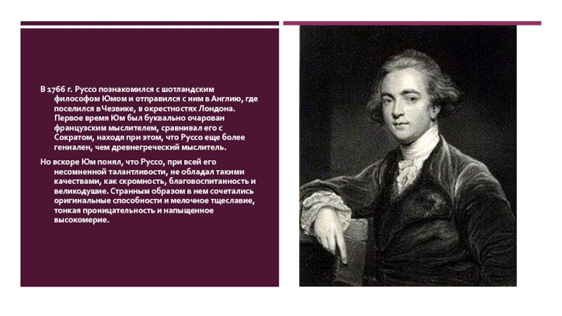 Слайд 15В 1766 г. Руссо познакомился с шотландским философом Юмом и отправился