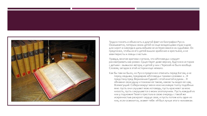 Слайд 17Трудно понять и объяснить и другой факт из биографии Руссо.