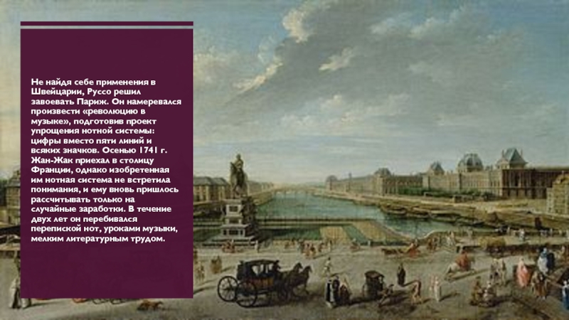 Слайд 6Не найдя себе применения в Швейцарии, Руссо решил завоевать Париж.