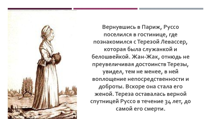 преувеличивая достоинств Терезы, увидел, тем не менее, в ней воплощение непосредственности и доброты. Вскоре она стала его женой. Тереза оставалась верной спутницей Руссо в течение 34 лет, до самой его смерти.