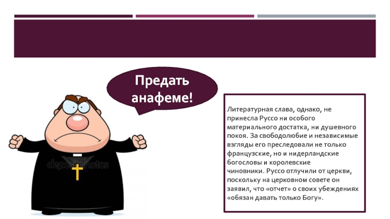 не только французские, но и нидерландские богословы и королевские чиновники. Руссо отлучили от церкви, поскольку на церковном совете он заявил, что «отчет» о своих убеждениях «обязан давать только Богу».