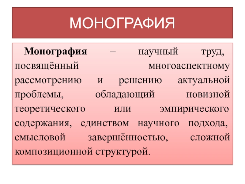 Монография – научный труд, посвящённый многоаспектному рассмотрению и решению актуальной