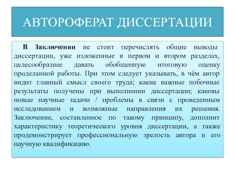 оценку проделанной работы. При этом следует указывать, в чём автор видит главный смысл своего труда; какие важные побочные результаты получены при выполнении диссертации; каковы новые научные задачи / проблемы в связи с проведенным исследованием и возможные направления их решения. Заключение, составленное по такому принципу, дополнит характеристику теоретического уровня диссертации, а также продемонстрирует профессиональную зрелость автора и его научную квалификацию.