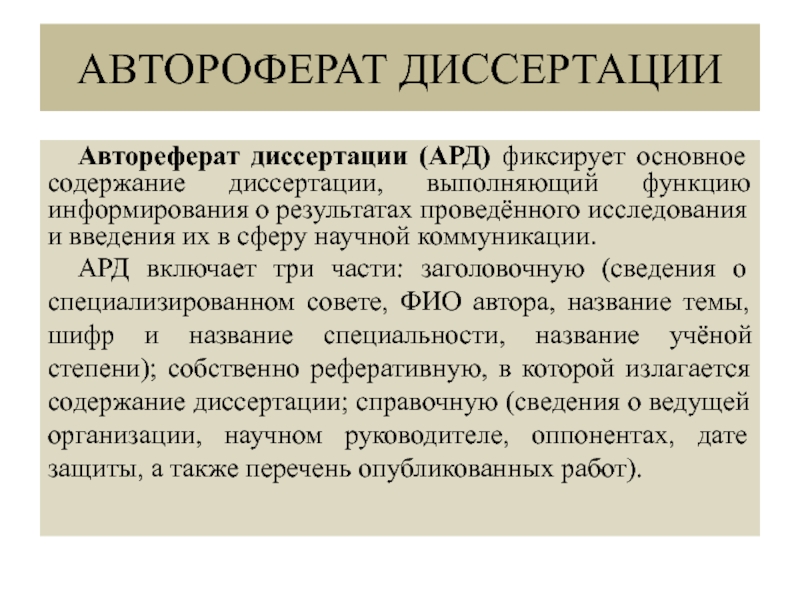 Автореферат диссертации (АРД) фиксирует основное содержание диссертации, выполняющий функцию