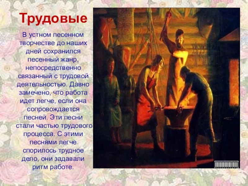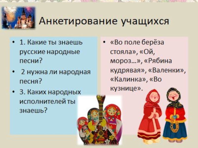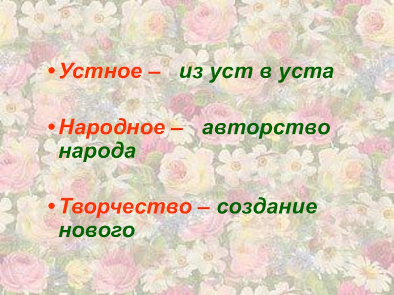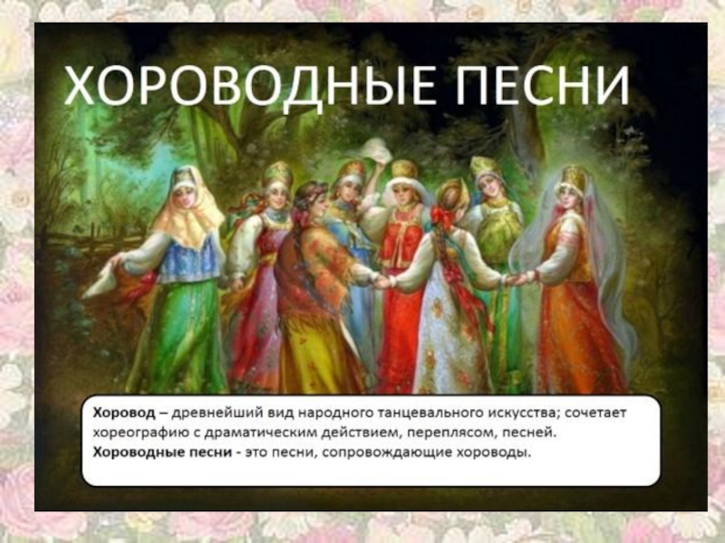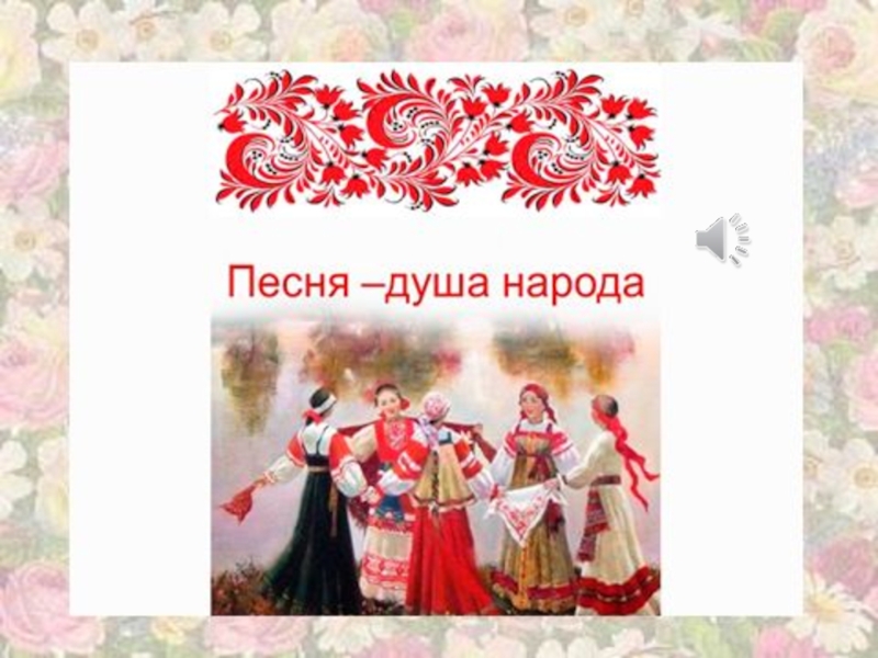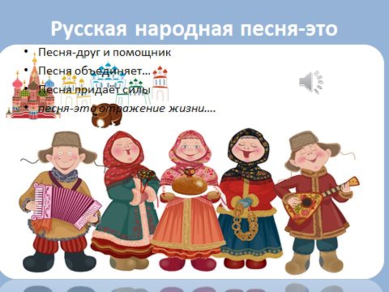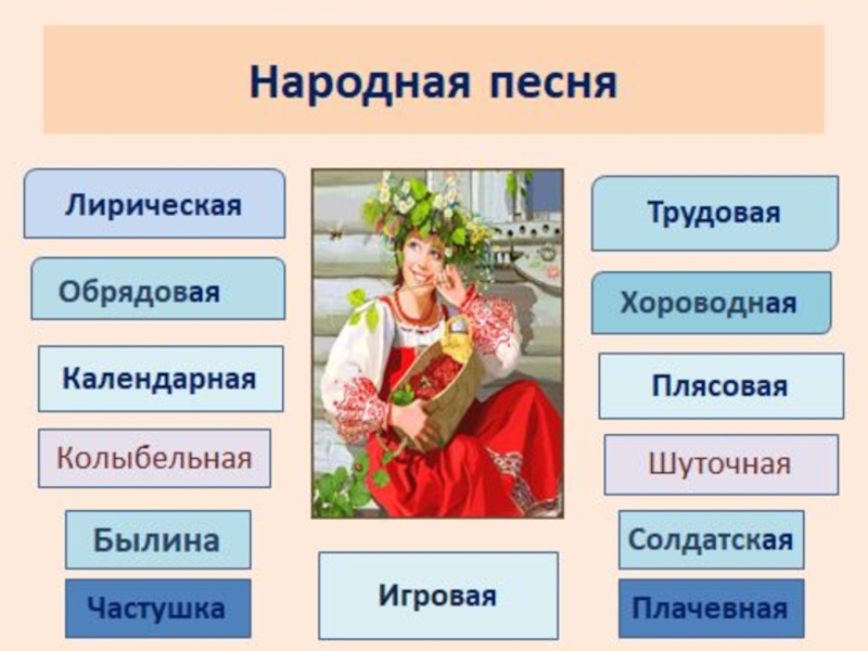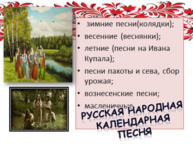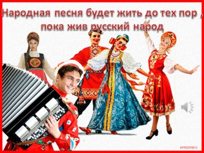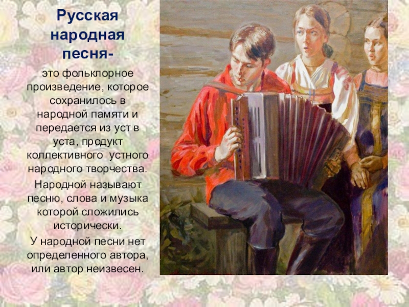 творчества.Народной называют песню, слова и музыка которой сложились исторически.