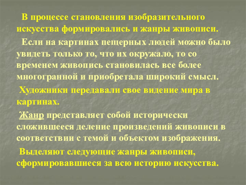 людей можно было увидеть только то, что их окружало, то со временем живопись становилась все более многогранной и приобретала широкий смысл. Художники передавали свое видение мира в картинах.