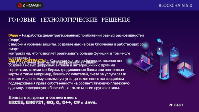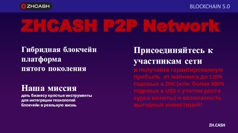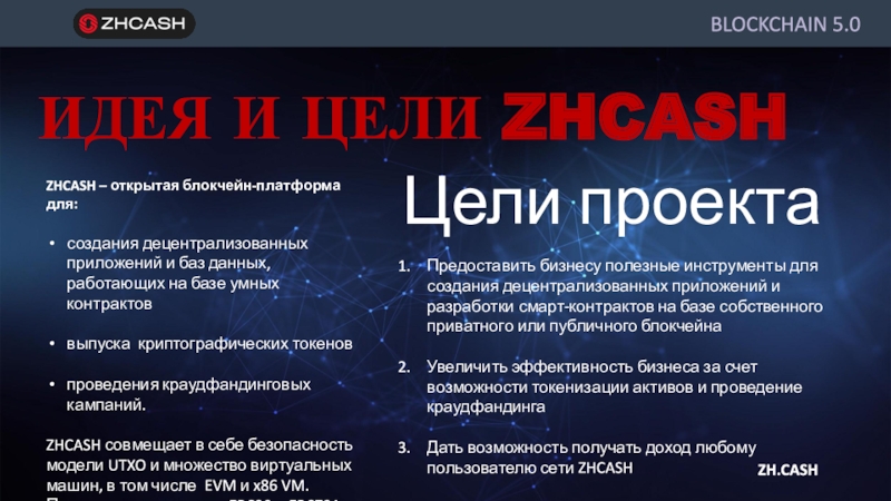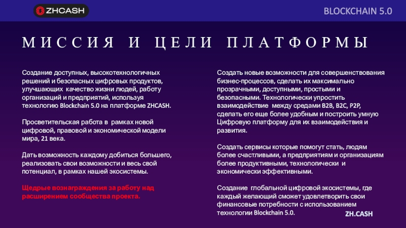 Создание доступных, высокотехнологичных решений и безопасных цифровых продуктов, улучшающих качество жизни людей, работу организаций и предприятий, используя технологию Blockchain 5.0 на платформе ZHCASH.