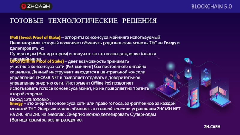 Energy – это энергия консенсуса сети или право голоса, закрепленное за каждой монетой ZHC. Энергию можно обменять в главной консоли управления ZHCASH.NET на ZHC или ZHC на энергию. Энергию можно делегировать Супернодам (Валидаторам) за вознаграждение.